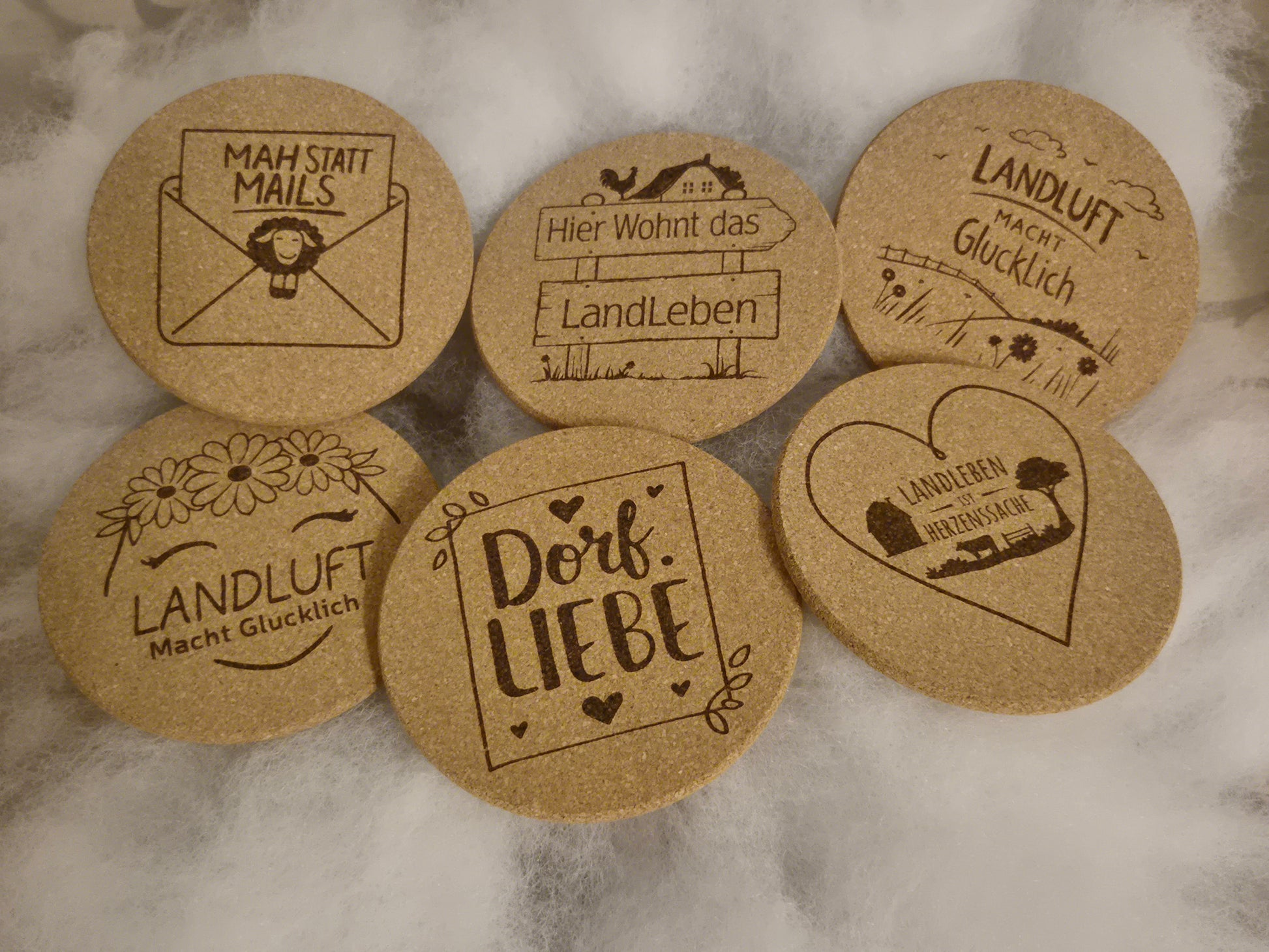 Kork Untersetzer im 6er Set mit Motiv Landleben – lasergraviert.
